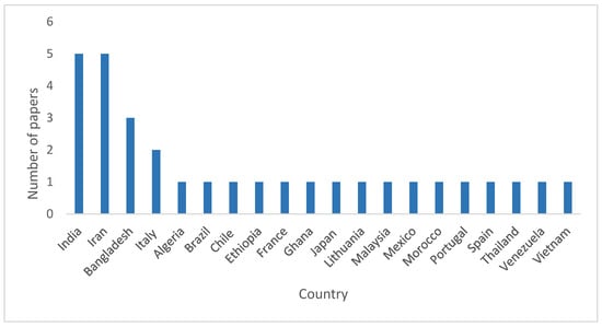 The geographic distribution of the included papers by country and by continent are shown in Figure 4 and Figure 5, respectively. Research on the selection of aquaculture sites using GIS-based MCE was carried out in 20 different countries around the world, and in different ecosystems. As illustrated in Figure 4, most studies were conducted in India and Iran, with five published papers for each; followed by Bangladesh, with three articles, representing a notable number of studies; then Italy, with two records. The remaining countries have only published one article.
