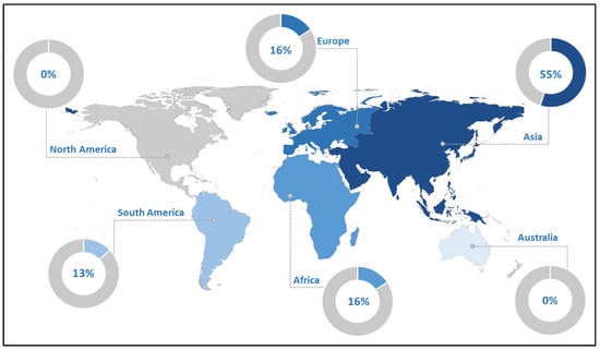 At a continental scale, the Asian continent accounts for the maximum number of studies, representing 55% of the research papers included in this review (Figure 5). Africa and Europe both represent 16% of published papers, while only four studies were conducted in south America (13%). It is worth noting that no study included in the present review was conducted in North America or Australia.