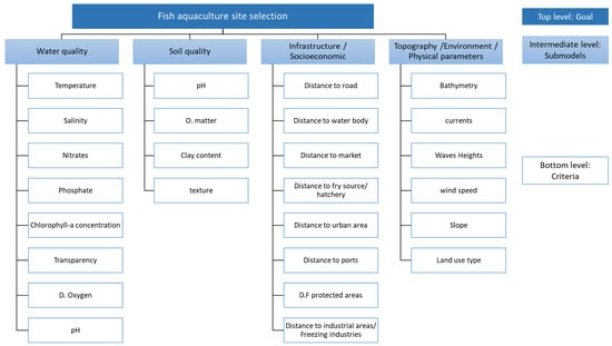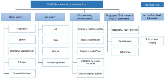 • Top level: presenting the goal of the study, which is the selection of suitable site for fish or shellfish aquaculture;