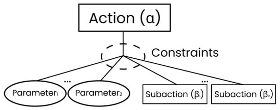 Once all the necessary components were identified, including parameters and constraints, the actions of the PlanGraph models were conceptualised. Following the outlined methodology, the process started with defining the root action/plan and then defining the parameters and constraints for each task, as depicted in Figure 2. Next, the type of action was identified based on the PlanGraph types discussed previously. Actions were classified as basic or complex, depending on whether users required prior domain knowledge to perform the task.