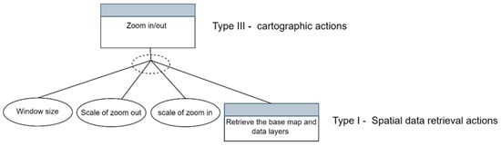 For example, tasks like “Zoom in” or “Pan to the left” were considered basic, while tasks like “Changing the steps for graduated colour” were deemed complex and involved sub-actions and plans. Each action type was determined based on its complexity, with Figure 3 illustrating an example of the basic task “Zoom in/out” in the PlanGraph model. In this model, the root plan aimed to achieve the zooming action, with parameters such as map window size, predefined scale, and the sub-action of reloading the basemap with pre-loaded data. The Zoom in/out task in the user interface is primarily performed by using the mouse wheel or enabling the Zoom in/out feature on the map. The window size is an important parameter derived from the User Interface code, and it plays a crucial role in recognising the specific visualisation that the user is referring to. All of these parameters are retrieved and considered for the PlanGraph model. The parameters and subactions are mainly visible and useful in the technical approaches and code implementation. The root plan was classified as a Type III action, focusing on visualisation modification, while the sub-action was considered Type I.