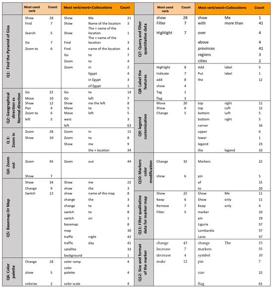 While the questionnaire provided valuable insights into geospatial interaction, we were concerned that our sample might be too limited to reflect the language patterns of the general public. To ensure a more representative understanding, we turned to NLP, given that it is based on extensive data sources. This would provide a broader perspective on the likely commands for map interactions. Consequently, we emulated the questionnaire using ChatGPT, a sophisticated AI language model developed by OpenAI. The aim of comparing responses generated by ChatGPT with the survey data was to gain a deeper understanding of the commands used and to corroborate the findings. Based on the questionnaire’s questions, a vast collection of voice commands was gathered, transcribed into text, and fed into ChatGPT for training and evaluation.