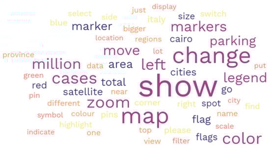 Our analysis revealed the most commonly used verbs in voice commands for map interaction: “show”, “change”, “locate”, “zoom”, “find”, “move”, and “filter”. The likelihood of using these verbs varied depending on the specific interaction performed and the user’s background knowledge. For instance, users with an environmental engineering background preferred the verb “locate”, whereas those with a computer science background tended to use the verb “search”. Notably, the AI-generated answers closely mirrored responses from human participants. Both sources utilised similar commands and verbs such as “show”, “find”, “zoom in”, and “locate”. However, there were differences in sentence structures. For short commands, humans tend to specify very simple and use very few words and simple sentences. In contrast, the human responses were more complex in more advanced tasks such as filtering geospatial data.