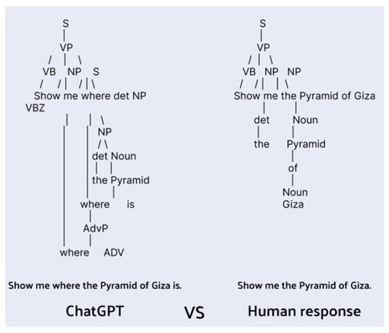 A comparison of the two most frequent sentences from ChatGPT and respondents revealed that AI-generated sentences tended to be more complex and informative, whereas humans typically used simpler and shorter sentences when interacting with a voice chatbot (Figure 7). In the Human response parse tree, S represents the sentence, VP represents the verb phrase, VB represents the verb, NP represents the noun phrase, and det represents the determiner. In the ChatGPT parse tree, S represents the sentence, VP represents the verb phrase, VB represents the verb, NP represents the noun phrase, det represents the determiner, VBZ represents the linking verb, and AdvP represents the adverb phrase. In the first sentence, “Show me the Pyramid of Giza”, the VP consists of only one verb “Show”, whereas in the second sentence “Show me where the Pyramid of Giza is”, the VP consists of two verbs “Show” and “is”, with a subordinate clause “where the Pyramid of Giza is” acting as the complement of the verb “Show”. This difference in the VP’s complexity reflects that the second sentence conveys more information since an AI generates it.