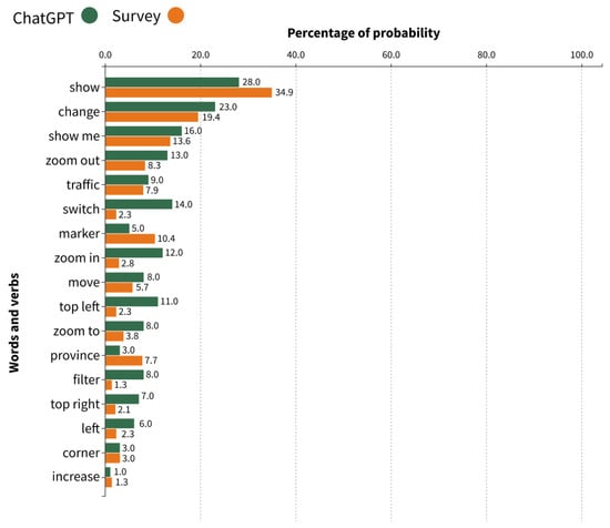 Our comparison between ChatGPT’s responses and those collected from human respondents highlighted similarities and differences. In most cases, the frequency of verb and word usage was similar. However, the complexity of sentence structures showed that humans tend to interact with virtual assistants more generally and simply. This tendency might be due to ease of use, limited time or patience, and advancements in natural language processing and machine learning that enable virtual assistants to comprehend and respond effectively to general queries. The comparison between the percentage of the probability of terminologies’ appearance among the two sources (ChatGPT and Survey) for the mutual words has been visualised in Figure 8.