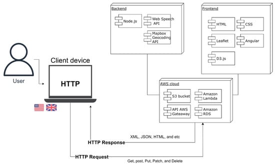 Given the platform’s influence on the architecture and engineering for developing virtual voice assistants in the scope of geospatial data visualisation, the application was developed in JavaScript language to ensure compatibility with the platform. The application’s architecture follows a REST API, an API that adopts a Representational State Transfer (REST) architectural style, using HTTP requests to access and use data. The main framework is Node.js, an open-source JavaScript runtime environment executing JavaScript code outside a web browser. The application also uses AWS cloud services like S3 Bucket and Lambda functions, with the front end developed using Angular, CSS, and HTML. The two main essential modules with crucial rules in the application are discussed in the following sections. Figure 9 visualises the architecture of the application.
