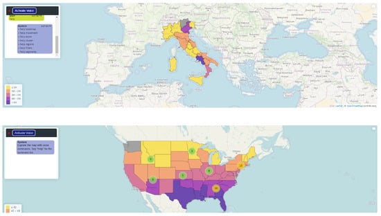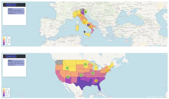 The interpret() function defines voice commands using regular expressions. Each recognized command triggers the appropriate function in VoiceMapChart.js. - VoiceMapChart.js: This script extends the code for the voice map chart’s structure. It encompasses marker and thematic map functionalities tailored for voice interactions. To enable visualization through voice commands, functions must be adapted to align with defined commands and callbacks in MainSpeechAPI.js.