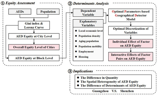 In general, the research methods were divided into three aspects: data collection, equity assessment, and determinant analysis (Figure 3). First, the data collection part has been described in the Data section. Then, the AEDs of the two cities were visualized in an intuitive way by using the kernel density method in ArcMap. The main methods used in equity evaluation were the GINI coefficient and the Lorenz curve. The equity evaluation was based on a multi-scale: city scale for comparison and block scale for further determinants analysis. Finally, determinant analysis applied the OPGD model to quantify the differences in the influencing factors of AED equity in Guangzhou and Shenzhen, including the individual effect of each factor on equity and the interaction effect of factor pairs on equity.