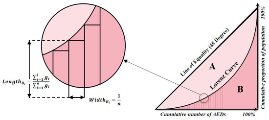 Measuring the AED equity at the city and block scale is of great necessity to understand the supply and demand balance between AED configuration and serving the local population. This study used the Gini coefficient and Lorenz curve to quantify AED equity, a combination commonly used to measure a variety of distributional inequalities, including income, wealth, education, and health [31,32,33,34,35]. The Gini coefficient and the Lorenz curve provide an intuitive way to visualize and quantify the extent of inequality, providing policymakers and researchers with tools to assess and compare inequality across different groups or regions [33].