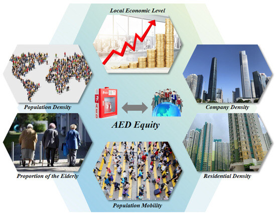 This study further identified and quantified the determinants affecting the spatial distribution of AED equity in Guangzhou and Shenzhen using the OPGD model. Based on the AED-related literature [4,7,8,9,10,13] and characteristics of the study area, we selected potential determinants from six aspects (Figure 5): local economic level, population density, proportion of elderly people, mobility, company density, and residential density.