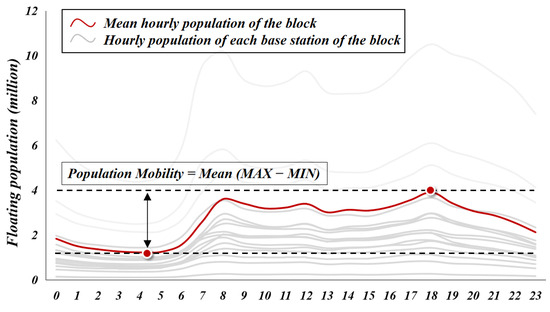In terms of data acquisition, the local economic level was expressed by block scale per capita GDP, which, together with population density and proportion of elderly people, were derived from the latest block statistical data provided by the government in December 2022. The company density and residential density were expressed by calculating the POI density of the company and residential community, which was obtained via Baidu Map API in December 2022. Population mobility is calculated based on cell phone signal data at the base station level, which was provided by the local operators with the largest market share [40,42,43]. The population mobility of a block is equal to the difference between the average maximum and average minimum population of all the base stations in the block (Figure 6). The statistics of the six determinants are listed in Table 1.