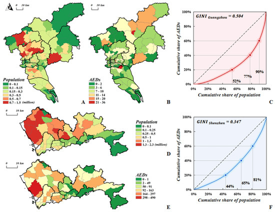 Distribution of population (A,D) and AEDs (B,E) and the Gini coefficients (C,F) at city level.