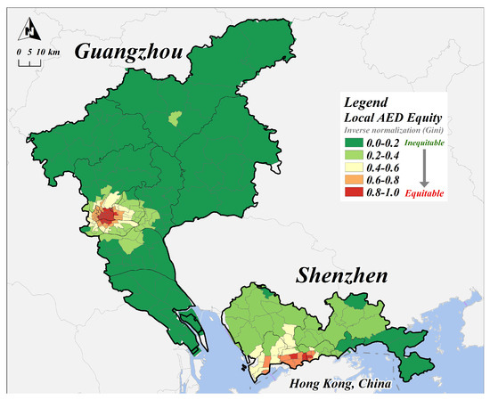 Despite the advantages of this study, some aspects need to be addressed in the future. First, we only analyzed the AED equity in the whole society in Guangzhou and Shenzhen and did not involve the equity in different social groups, which should be expanded in the future. Secondly, OHCA case data should be considered to accurately evaluate the social coverage of the distribution of AED facilities in the future. Third, though the spatial distribution of AED equity at block level was uncovered in this study, the spatially varying associations between influencing factors and AED equity should be considered in future work by using the geographical weighted regression [50,51,52].
