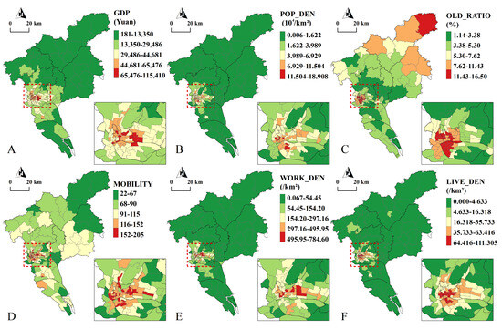 Spatial distribution of determinants in Guangzhou, including GDP (A), POP_DEN (B), OLD_RATIO (C), MOBILITY (D), WORK_DEN (E), LIVE_DEN (F).
