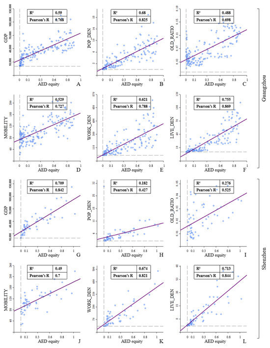 Scatter plots of AED equity and selected determinants including GDP (A,G), POP_DEN (B,H), OLD_RATIO (C,I), MOBILITY (D,J), WORK_DEN (E,K), LIVE_DEN (F,L).