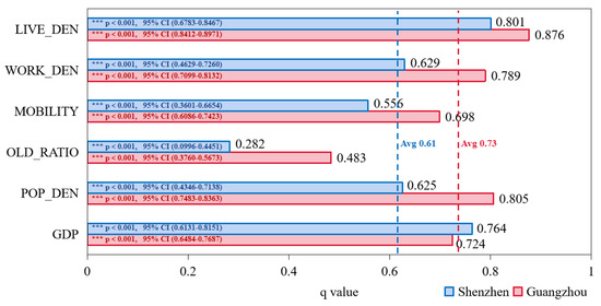In general, the average explanatory power of determinants for AED equity in Guangzhou (average q value = 0.73) was higher than that in Shenzhen (average q value = 0.61). According to the geographical detector model, determinants explained 73% of the variance of AED equity distribution in Guangzhou on average, which was 19.7% higher than that in Shenzhen. In the Guangzhou case, LIVE_DEN was the determinant with the highest q value (0.876), followed by POP_DEN (0.805), WORK_DEN (0.789), GDP (0.724), MOBILITY (0.698), and OLD_RATIO (0.483). In the Shenzhen case, LIVE_DEN was also the determinant with the highest q value (0.801), followed by GDP (0.764), WORK_DEN (0.629), POP_DEN (0.625), MOBILITY (0.556), and OLD_RATIO (0.282). Among these variables, LIVE_DEN, POP_DEN, and WORK_DEN were above average in Guangzhou, and LIVE_DEN, GDP, and WORK_DEN were above average in Shenzhen, which illustrates that these were the major determinants of AED equity in Guangzhou and Shenzhen from the perspective of individual effect.
