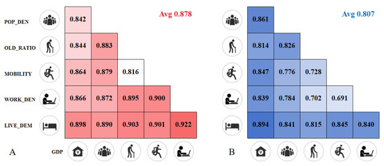 The scatter plots of AED equity and selected determinants in Guangzhou and Shenzhen are presented in Figure 14, which indicate the correlation relationships. Six selected variables were found to be significantly and positively associated with AED equity. Among the variables in the Guangzhou case, LIVE_DEN was the variable with the highest Pearson’s R (0.869), followed by POP_DEN (0.825), WORK_DEN (0.788), GDP (0.768), MOBILITY (0.727), and OLD_RATIO (0.698). In the Shenzhen case, LIVE_DEN was also the variable with the highest Pearson’s R (0.844), followed by GDP (0.842), WORK_DEN (0.821), MOBILITY (0.7), OLD_RATIO (0.525), and POP_DEN (0.427).