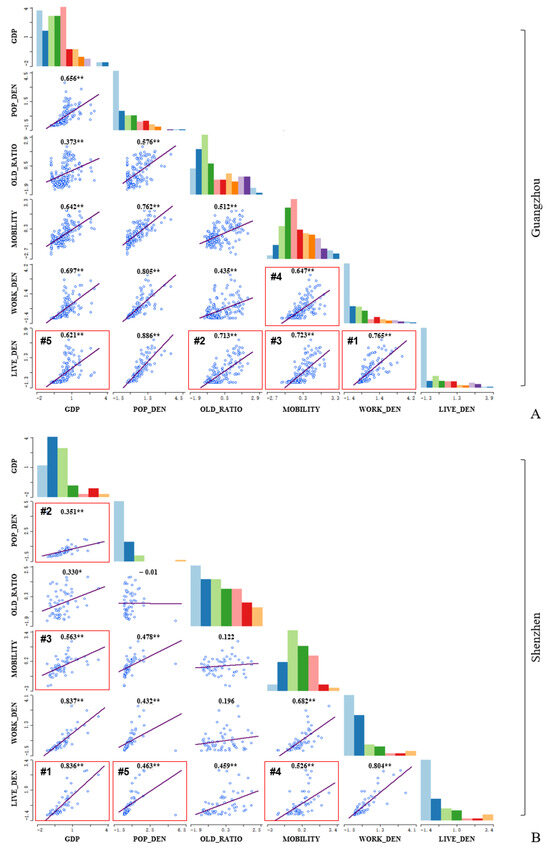 Scatter plots between determinants in Guangzhou (A) and Shenzhen (B). #1-5 are the scatter plots of the top five pairs of determinants in the interaction detector model. (** and * indicate significance at the level of p-value < 0.01 and p-value < 0.05).