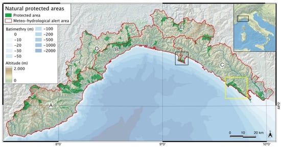 Physical map of the Liguria region. A, B, C, D, and E are the hydrometeorological alert zones. The black square highlights the Portofino Promontory and the yellow one the Cinque Terre National Park.