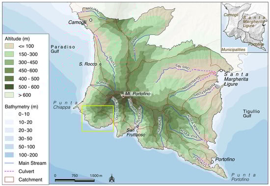 Its trapezoidal shape breaks the continuity of the coastline between Genoa and La Spezia, representing the watershed between the Paradiso Gulf and the Tigullio Gulf (Figure 2). The promontory is configured as a mountain ridge with a NW–SE orientation, culminating with the peak of Monte di Portofino (610 m) []. Short streams, mainly of the first order, originate from the main watershed (Figure 2). The mountain ridge determines an abrupt and significant orographic elevation in relation to the proximity to the coastline, which lies at about 1 km from the main watershed. This has a strong influence on the climate conditions of the whole compartment. In fact, the Portofino Promontory represents the border between zone-B and zone-C of the Ligurian meteo-hydrological alert subdivision (Figure 1).