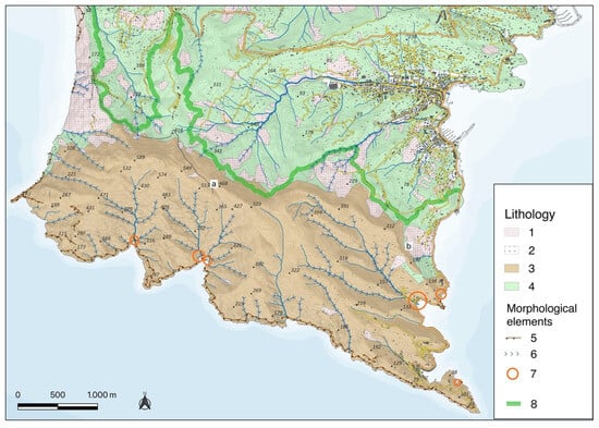 Geological and geomorphological sketch map of Portofino Promontory. (1) Landslides, quaternary deposits; (2) Fills; (3) Portofino Conglomerates; (4) Mt. Antola Formation. (5) Cliffs; (6) V-shaped valleys; (7) Pocket beach (8) Border of the Portofino Natural Park; a. Pietre Strette; b. Le Gave.