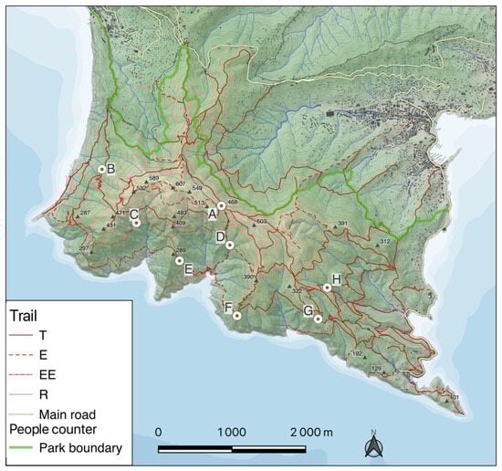 The network of hiking trails of the Portofino Promontory and people counters, identified with letters (see Table 1 as a reference).