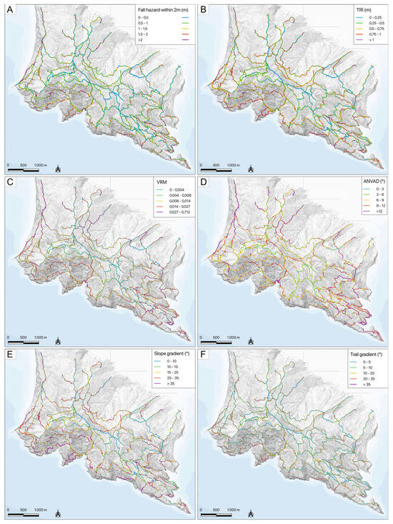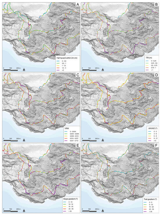 Morphological features of trails, detail: (A) Fall hazard within 2 m; (B) TRI; (C) VRM; (D) ANVAD; (E) slope gradient; (F) trail gradient.
