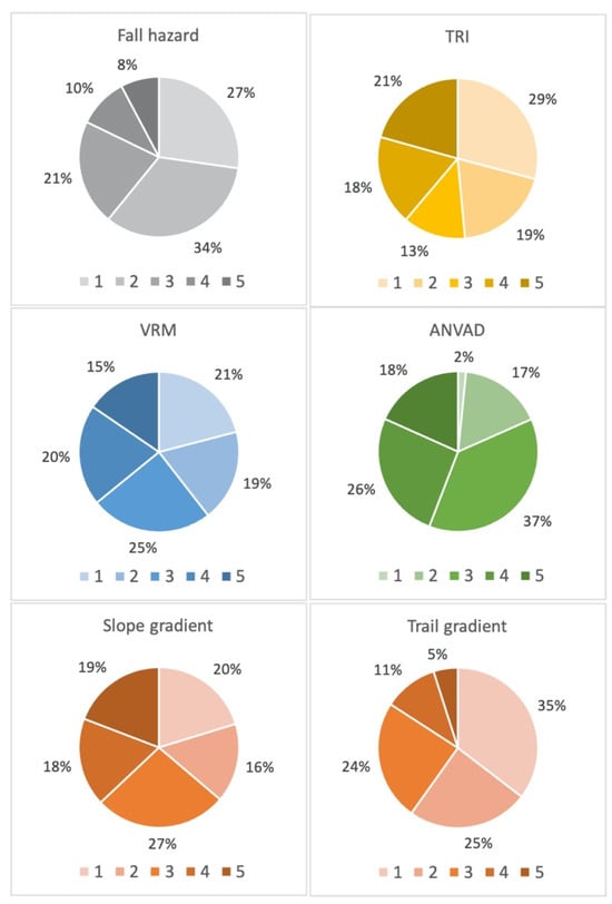 Finally, Figure 7 shows the diagram of the trails’ length distribution among the five respective classes of the different calculated parameters. Fall hazards within 2 m represent 18% of the total trails’ length in the two higher classes and the corresponding trails develop along the south facing slopes. TRI, VRM, and slope gradient are almost equally distributed in the respective 5 classes, while ANVAD and trail gradient present a distribution similar to the Fall hazard within 2 m, with values mostly concentrated in the lower 3 respective classes.