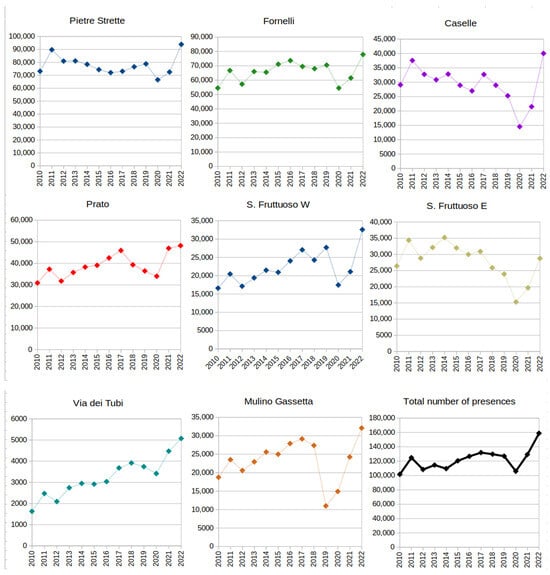 Data collected from the nine eco-counters installed in the Natural Park allow estimation of the frequentation of the hiking trails in the years 2010–2022. The minimum number of total yearly presences within the park shows a light increase in the second part of the study period (Figure 8). In the year 2020, a great drop in the total presences can be observed due to the restrictions due to the COVID-19 pandemic. In 2021, with no more restrictions, the total presences were similar to the pre-pandemic years, while in 2022, the total presences further increased.