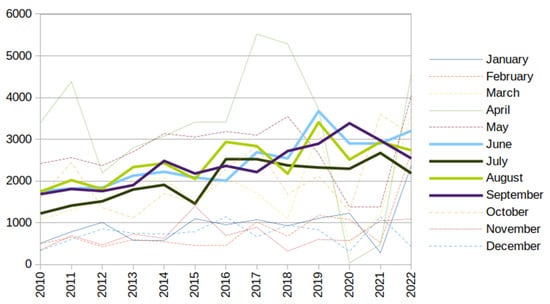 In Figure 9, the passages per month in the study period are shown for the San Fruttuoso W station. The station recorded the highest frequentation in mid-spring (April and May). However, while the number of passages in the winter, spring, and autumn months has remained relatively stable, the number of passages in the summer months (especially June and July) has strongly increased from 2010 to 2022.