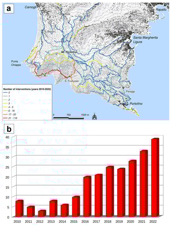 The CNSAS interventions are not distributed evenly in the Park area. About half of the rescue operations (50.2%) have been carried out along the “Passo del Bacio” path, from le Batterie to San Fruttuoso, which is the most difficult of the freely walkable paths of the Park. Other paths that have seen a notable number of rescue operations are the one from Pietre Strette to San Fruttuoso (8.3%) and the one from Base O to San Fruttuoso (5.2%). The remaining operations were scattered among all the other trails of the network (Figure 10a). The number of interventions per year has strongly increased in the second part of the decade, growing from 3 to 8 per year in 2010–2015 to 24 to 38 per year in 2018–2022 (Figure 10b).