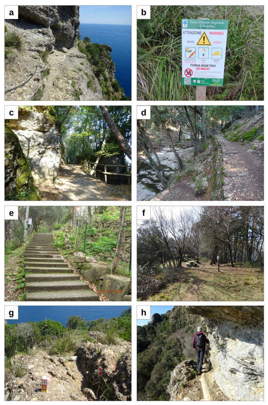 The hiking trail network of the Portofino Natural Park. (a) Exposed path with cables at the Passo del Bacio. (b) Warning sign near the Passo del Bacio. (c) Dirt road at Pietre Strette. (d) Ancient, cobbled mule track between Pietre Strette and San Fruttuoso. (e) The stairway from San Rocco to Punta Chiappa. (f) Crossroads and picnic area at Sella Porcile. (g) SOS marker along the path from Passo del Bacio to San Fruttuoso. (h) Exposed stretch of the Via dei Tubi.