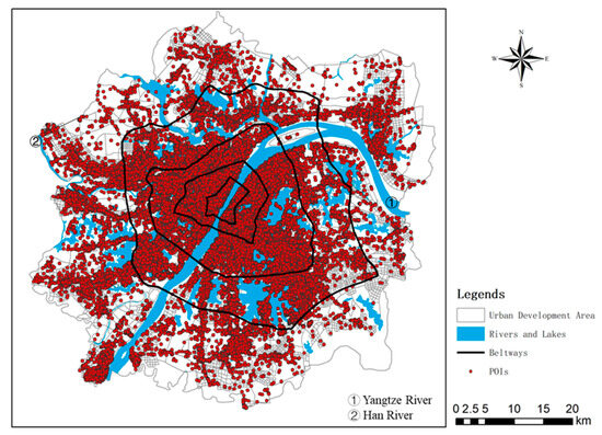 The urban development area of Wuhan was used as the study area; it is the main area for the concentration of urban spatial elements and spatial expansion [45]. By 2020, Wuhan had a resident population of 11.12 million and an administrative area of 8569 km2, of which the urban development area is 1045 km2. Based on the regional coordinated development strategy of a rational division of labor and optimal development, the government proposed an effective strategy during the 14th Five-Year Plan period to promote multi-centered, networked, and clustered development of the city with a view to building a spatial development pattern of “one main city and four sub-cities” and integrated urban and rural development [46].