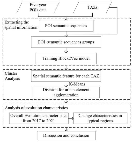 The aim of this study was to investigate the spatial agglomeration pattern of urban elements during different time periods. The overall framework is shown in Figure 2. Firstly, the Block2Vec model was employed for extracting spatial features from the POI data; this model mainly considers the spatial features between each POI within a specific TAZ and the spatial interaction features between TAZs. Second, TAZs with different agglomeration features could be obtained by performing K-Means clustering analysis on the extracted spatial features. Finally, a spatial–temporal comparison analysis of these categories across different time periods was performed, and the changes in spatial distribution of various agglomerative features were analyzed using spatial autocorrelation statistics.