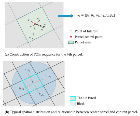 Different urban elements tend to cluster or be mutually exclusive in geographical space, indicating the presence of spatial information between spatial elements that can enhance the understanding of spatial interaction [28,41]. In this study, the Block2Vec model was used to establish the spatial semantic sequences and the central-context block spatial correspondence for all the TAZs. Taking the central TAZ depicted in Figure 3 as an example, the POI sequence Si was constructed based on the distance from the POI location to the center of this TAZ. The semantic sequence group )] of this special TAZ was then constructed based on the spatial proximity between this TAZ and the surrounding TAZs. Inspired by the skip-gram framework in natural language processing [47], the Block2Vec model was constructed using an encoder and four decoders based on a Long Short-Term Memory (LSTM) network. A detailed description of this model can be found in previous studies [44].
