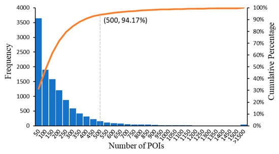 POI data spanning five years were utilized to construct POI sequences based on the three-level categories. A total of 29,254 sequences were obtained in the urban development area, while 11,586 spatial groups corresponding to the main urban area were acquired. Figure 4 illustrates a long-tailed distribution pattern with most POI sequence lengths being relatively short. Excluding TAZs without available POIs, the range of TAZs’ POI sequences varied from a minimum of 1 to a maximum of 3074, with an average length of 170. Furthermore, as 94.17% of all TAZs had sequence lengths of less than 500, a sequence length of 500 was chosen for this study.