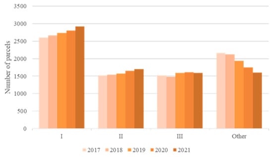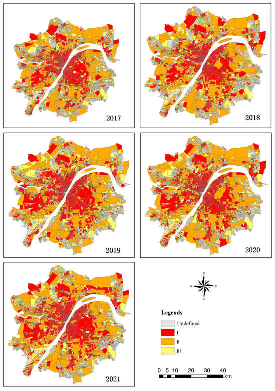 Figure 7 shows the change in the number in each class for the years 2017–2021, with the “other” class representing TAZs for which POI data are unavailable. A significant difference can be clearly observed in the trends of change among the various classes. Over time, the number of TAZs without POI data gradually decreased. At the same time, the number of TAZs with both high and medium agglomeration (category I and category II in Figure 7) increased to varying degrees, whereas the number of TAZs with low agglomeration (category III) experienced a slight increase. By combining the spatial distribution characteristics in Figure 5, it was found that during the urban development and expansion, areas with a low agglomeration of elements surrounding the city underwent significant development. The overall service integrity gradually improved, resulting in a transformation into medium or high agglomeration. Meanwhile, previously undeveloped areas gradually developed, ultimately evolving into areas with low agglomeration.