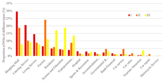 Distribution of POIs in the three types of clusters at the primary level of classification.