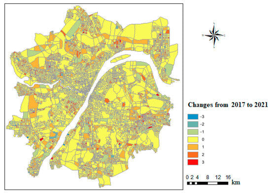 Distribution of changes in urban element agglomeration from 2017 to 2021.