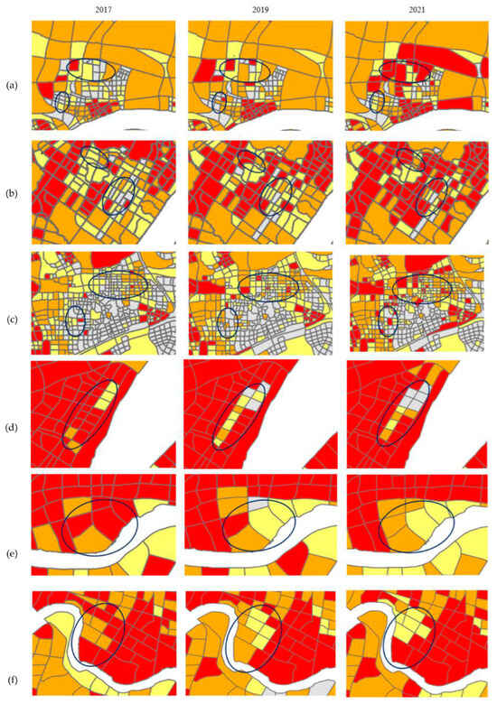 Spatial distribution of urban element concentration in typical regions from 2017 to 2021: (a) Changjiang New Area, (b) Sixin District, (c) Guanggu East, (d) Erqi Riverside District, (e) Hanzheng Street, (f) Gutian Area.