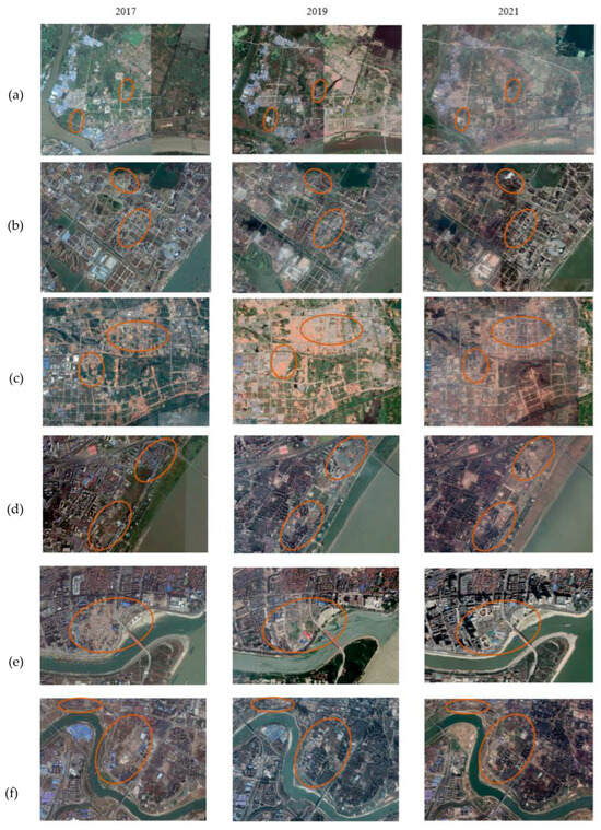 Remote sensing images of typical regions from 2017 to 2021: (a) Changjiang New Area, (b) Sixin District, (c) Guanggu East, (d) Erqi Riverside District, (e) Hanzheng Street, (f) Gutian Area.