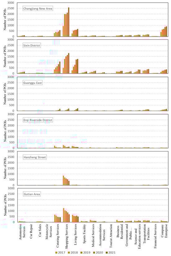 Changes in the numbers of different categories of POIs in typical regions, 2017–2021.