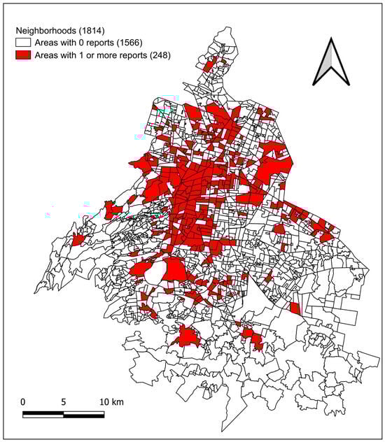 The 911 reports and information on parking meters contain geographic coordinates that facilitated the classification of the 1814 neighborhoods of the city into four groups: neighborhoods with the presence of parking attendants, those with parking meters, those that had both characteristics, and those with neither characteristic (Table 1). We identified 20 neighborhoods that reported the presence of parking attendants and parking meters, 228 with only parking attendants, and 12 with only parking meters. Finally, 1554 neighborhoods did not report either parking attendants or parking meters. Figure 1 shows the neighborhoods with at least one report of the presence of parking attendants (248).