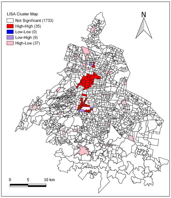 LISA map where 35 neighborhoods spatially concentrate reports of parking attendants in Mexico City during 2019. Significance level of 99%.
