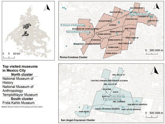 Figure 2 shows neighborhoods with high levels of reports of parking attendants surrounded by neighborhoods with similar levels. These neighborhoods, in red, form two different hotspots of social disorder in Mexico City. It is interesting to note that the hotspots shown in Figure 2 overlap the tourist corridors of Roma-Condesa and San Angel-Coyoacan (Figure 3), in which are concentrated many of the main museums and places of interest for national and international tourists in Mexico [68]. In fact, 40 of the 52 museums in the city are located within these clusters (76.92%). The neighborhoods and their surroundings undergo constant maintenance by the city government due to their national and international attraction [68]. Such is the case of the Frida Kahlo Museum, dedicated to the celebrated painter and located in the “Del Carmen” neighborhood, and the National Museum of Anthropology in “Bosques de Chapultepec” that exhibits the main archaeological pieces found from Aztec and Mayan cultures. Figure 3 shows the museums as green points located within the hotspots of Figure 2 and Figure 4.