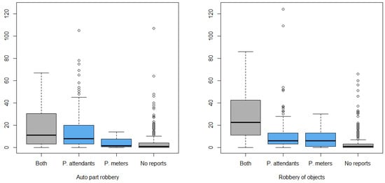 A comparison was made between areas with a high demand for parking on public roads, where one area had signs of social disorder. Neighborhoods with reports of parking attendants but no parking meters (228 neighborhoods) were compared with neighborhoods with parking meters and no parking attendants (12 neighborhoods). Non-parametric tests were used given that the count distribution of crimes per neighborhood were distributed differently to the Gaussian bell-shaped distribution. The Kolmogorov [64] Smirnov [65] and Wilcoxon [66] tests were thus implemented, with the latter applied in a differentiated way between the groups. The Wilcoxon test analyzed whether there were significant differences between the medians of property crimes against vehicles in each neighborhood. The Kolmogorov–Smirnov test compared the accumulated distributions of the property crimes against vehicles in the neighborhoods to analyze whether there were significant differences in addition to the median. This test also detected ties in the data that complicated appropriate calculations (R-4.3.1 for Windows was used). We present the results of both tests, as they show significant differences in auto part robbery and intentional damage, although not in the robbery of objects.