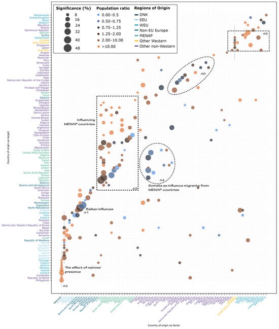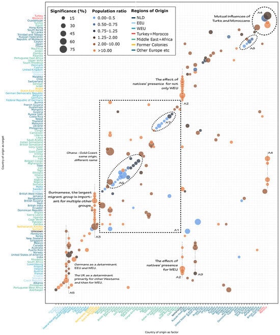 Specifically, the figures illustrate the influence of one CoO on another as a function of their population size ratios. The factor-country and the target-country are plotted on the horizontal and vertical axes, respectively. On both axes, the countries are coloured by their RoO. A high vertical concentration of bubbles indicates the influence of the factor on several other groups. The size of the bubbles illustrates the importance of the factor-country on the horizontal axis in predicting the population of the target-country on the vertical axis; the larger the bubble, the greater the importance. Their colour indicates the ratio of the population of the factor-country to the target-country; oranges indicate that the factor-population is larger than the target-population, and blues indicate that the factor-population is significantly smaller than the target-population.