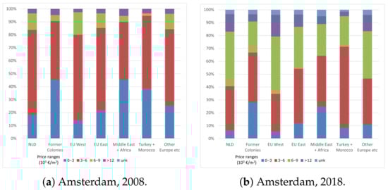 In Amsterdam, the changes were not as radical, but variations are observed among the groups. Two-thirds of migrants from the former colonies, the MEA region, Turkey and Morocco would still pay less than 6000 €/m2 in 2018, while at the top of the scale, most natives and migrants from the WEU and the rest of the world would pay more than 6000 €/m2.