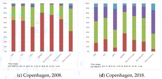The charts illustrate that large proportions of all groups moved upwards at least one price category. In both cases, most natives and migrants lived in areas with house prices in the two lowest price intervals in 2008 (<6000 €/m2 and <25,000 DKK/m2). On the contrary, in Copenhagen in 2018 the vast majority of the population belonged to the three highest intervals. The shares of the population paying more than 35,000 DKK/m2 increased exponentially (purple and light blue bars in Figure 3c,d). In 2018, half of the Western and WEU migrants lived in areas with house prices between 35,000 and 45,000 DKK/m2, and 10% of them in even more expensive areas. Most migrants from MENAP and non-EU European countries lived in the areas with the lowest house prices.