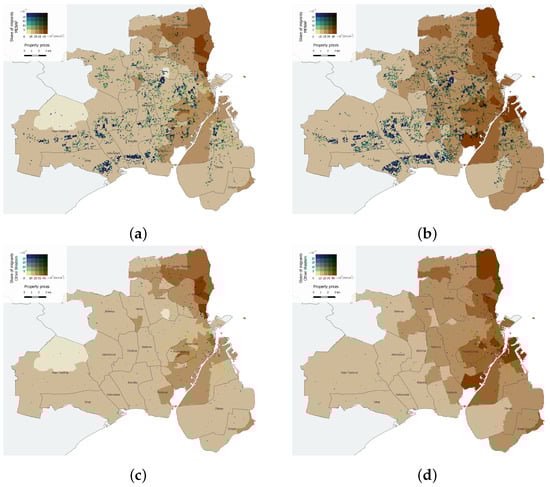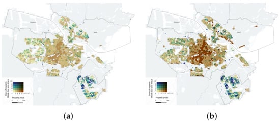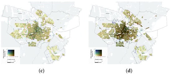 We also investigated the relationship between the distribution of migrants and house prices. We examined whether migrants bought more expensive properties in areas that were more attractive to them or where their residential density was higher. We estimated the sum of purchase prices by migrant group per grid cell along the inhabited cells as described in Equation (1), where i is the individual grid cell, Nim is the migrant population in cell i, Nm is the total migrant population in the examined area and Pi is the real estate price in the individual grid cell. The bivariate maps show the distribution of the share of migrants in the total population in relation to house prices (see Figures 4 and 5). That way, we explored the proportions of migrants living in zones of expensive/inexpensive housing and how these tendencies were represented spatially in each city.